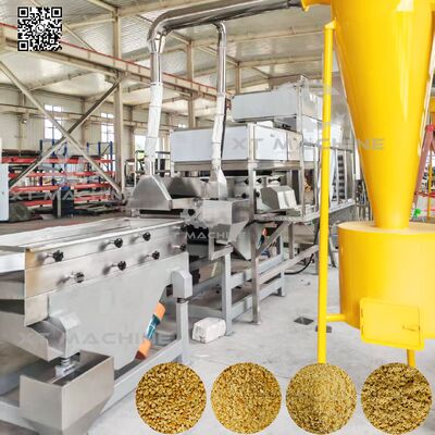 يتم تغذية الفول السوداني المقشر والمقسم إلى المفرمة عبر ناقل رأسي، حيث يتم تقطيعه أولاً إلى حبيبات خشنة بواسطة جهاز التقطيع الأولي. ثم تتدفق المادة إلى آلية التقطيع في المرحلة الثانية، مما ينتج عنه محببات مختلطة. مع منخل اهتزازي مدمج، يتم فرز الناتج إلى أربع مواصفات موحدة، مقسمة عادةً إلى 5-8 شبكة، 8-10 شبكة، 10-12 شبكة، مع مادة أقل من 12 شبكة تحقق ملمسًا مسحوقًا.